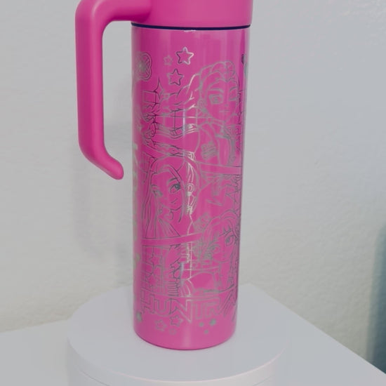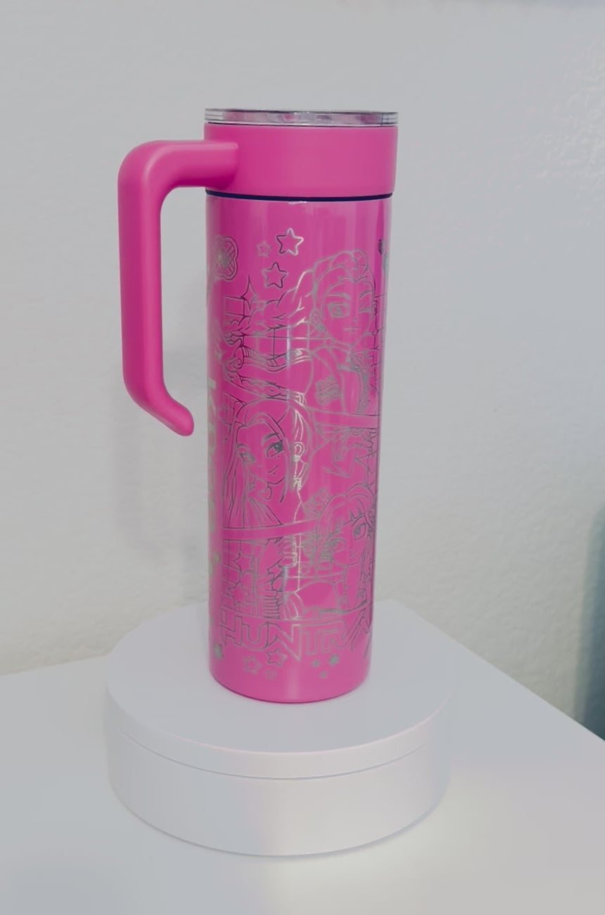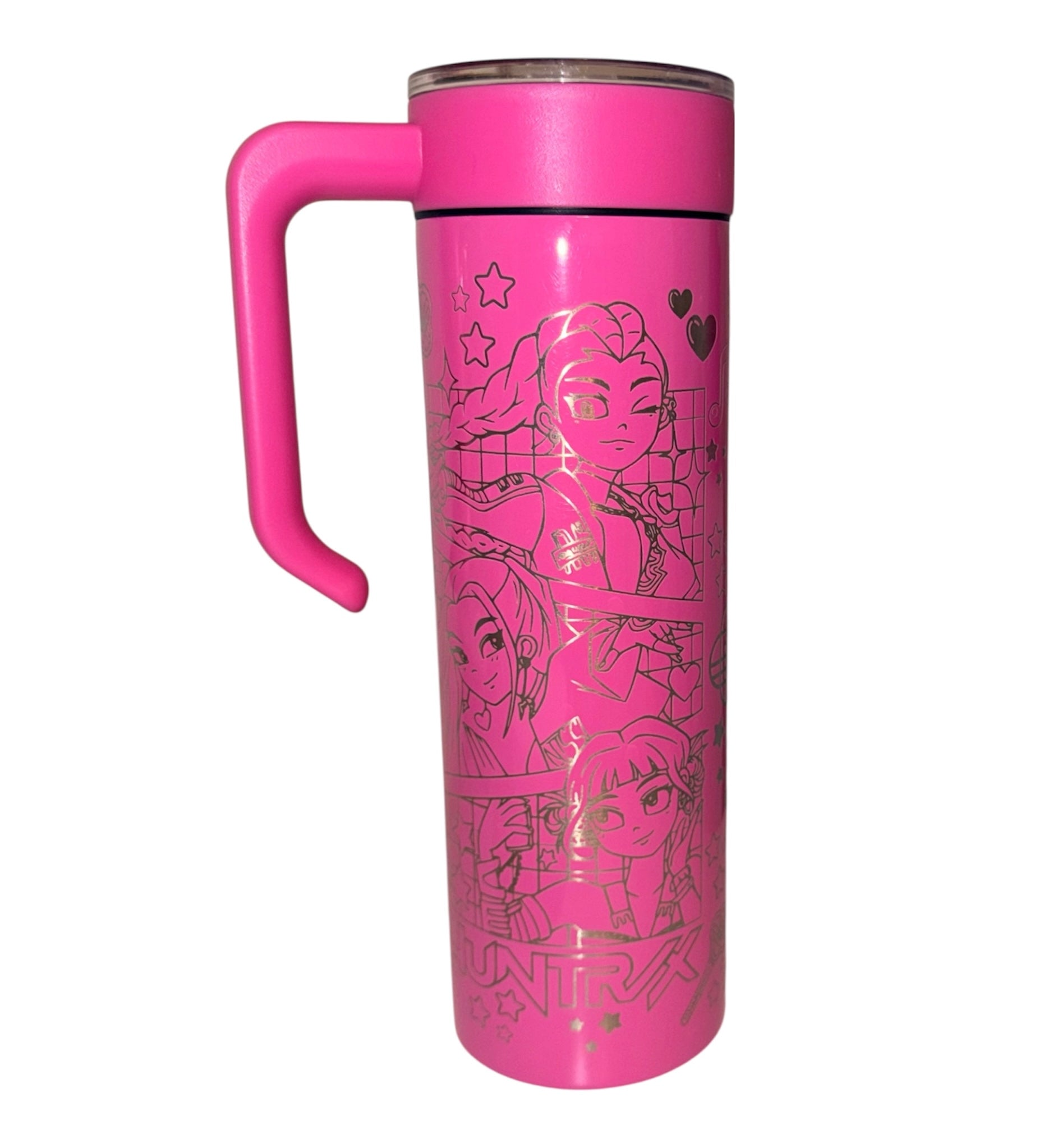 Bring bold K-pop energy to your everyday routine! This vibrant pink 20oz stainless steel tumbler with pink removable handle features sleek silver engraved character art, stars, hearts, and music icons for the ultimate fan-inspired aesthetic.